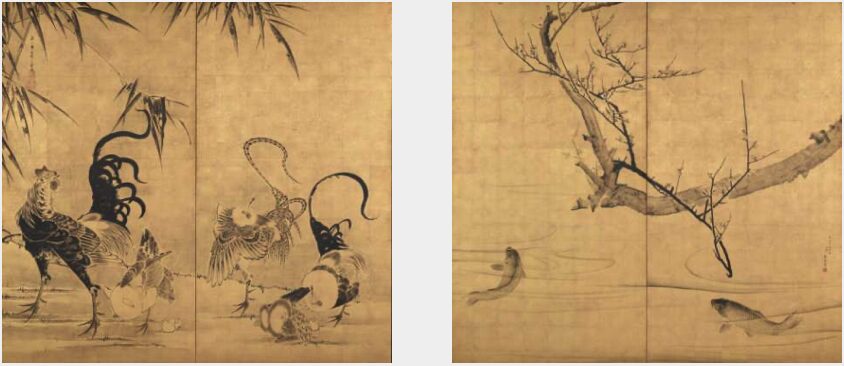 応挙の手になるのは梅の枝の下に鯉が泳ぐ「梅鯉図屏風」、そして若冲の作は得意の鶏を描いた「竹鶏図屏風」です。